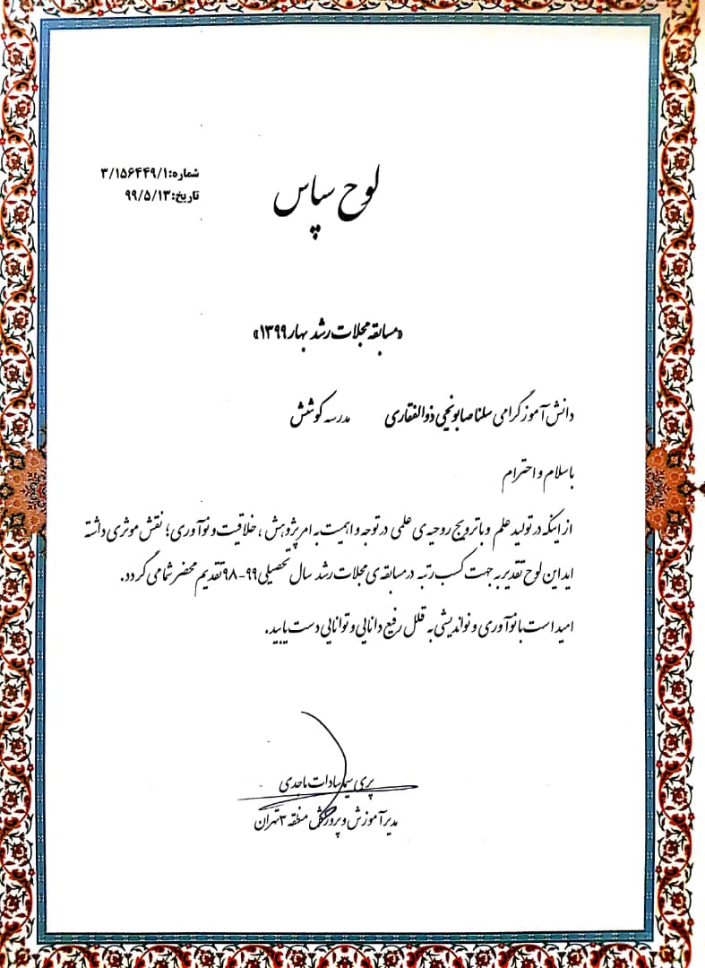 کسب رتبه در مسابقات مجلات رشد سال 99 توسط دانش آموز سلنا ذوالفقاری
