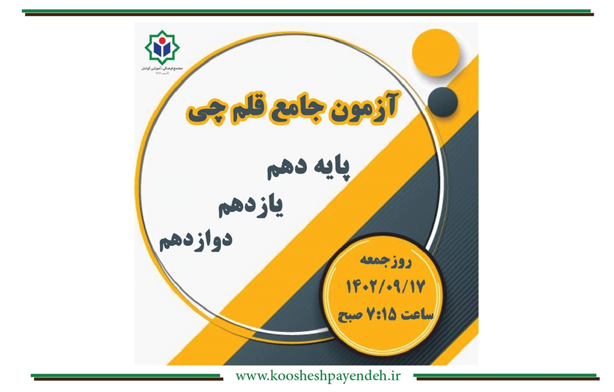 به همین مناسبت مجتمع کوشش با همکاری آموزشگاه قلمچی اقدام به برگزاری آزمونهای دورهای کرده است. روز جمعه 17 آذر ماه آزمون جامع قلمچی به میزبانی مجتمع کوشش برگزار شد.