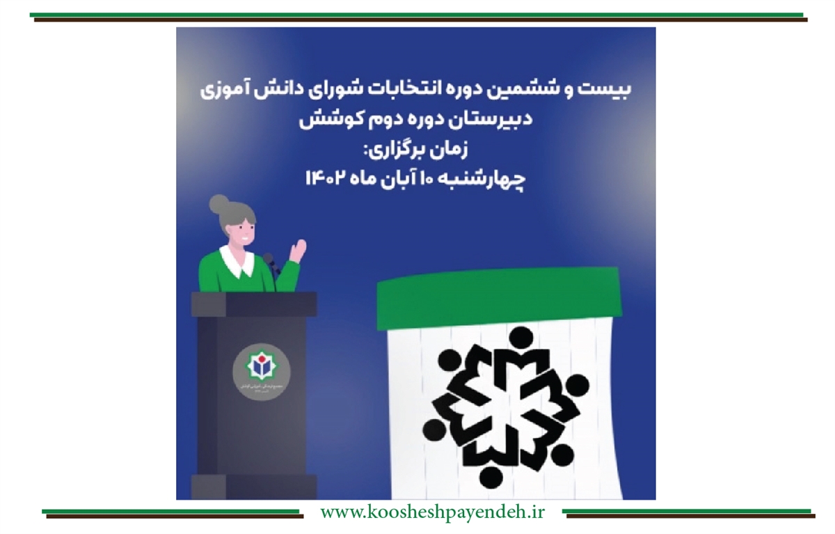 بیست و ششمین دوره انتخابات شورای دانش آموزی دبیرستان دوره دوم کوشش روز چهارشنبه ۱۰آبان ماه برگزار می گردد.